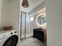 Une entrée avec placard, une agréable pièce de vie lumineuse avec cuisine ouverte traversante et accès balcon, une chambre avec balcon privatif, une spacieuse salle d'eau moderne avec espace buanderie, ainsi qu'un WC indépendant avec lave-mains.