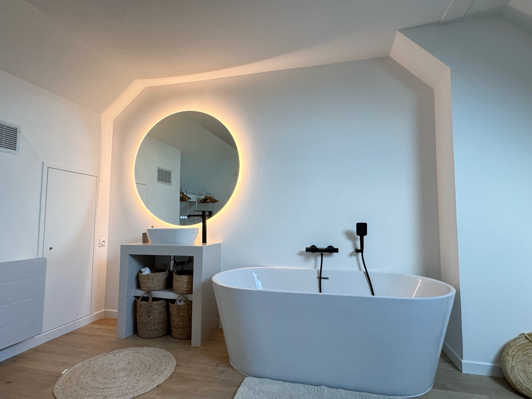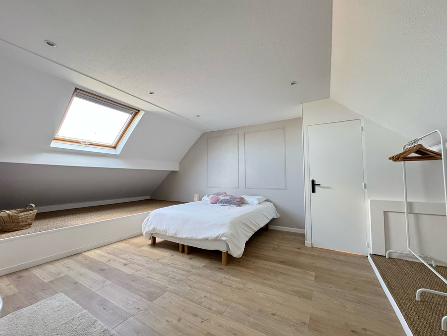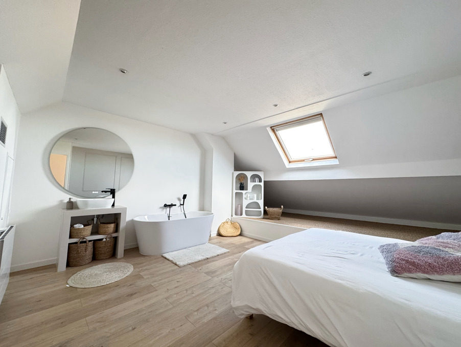À l'étage, vous découvrirez une grande chambre avec salle de bains privative et de nombreux rangements intégrés sous pente.