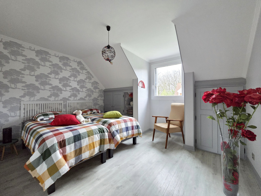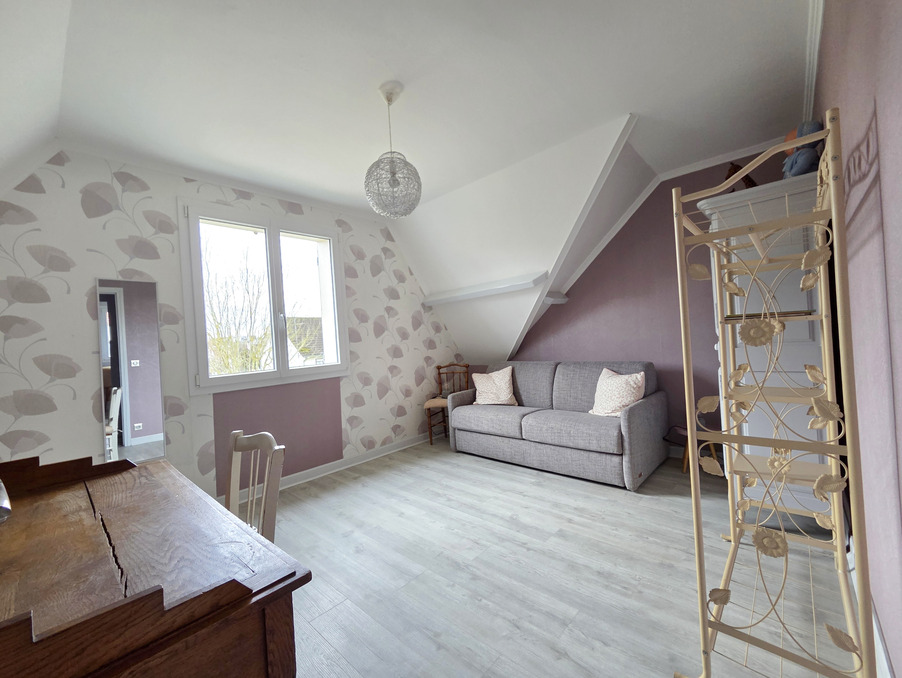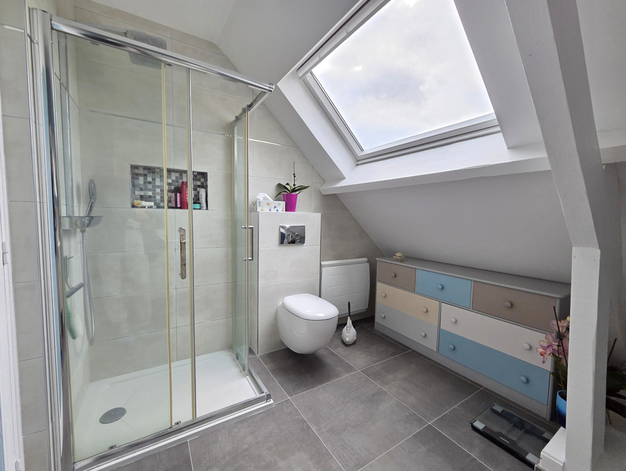 À l'étage, vous découvrirez quatre belles chambres, dont une spacieuse de 17 m2, ainsi qu'une salle d'eau avec WC.
