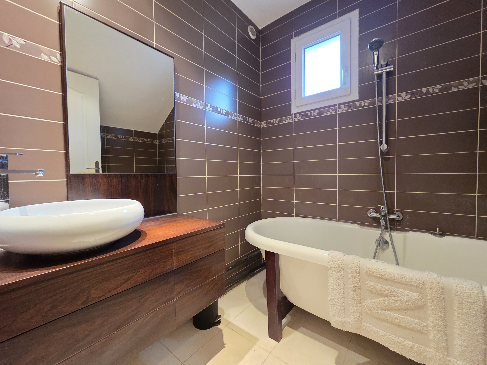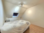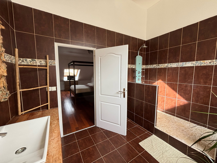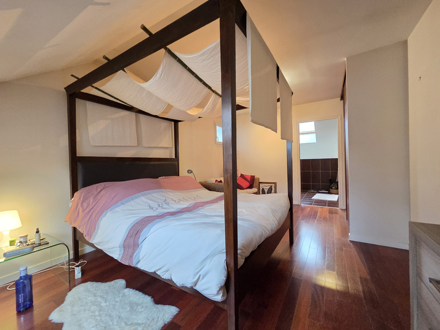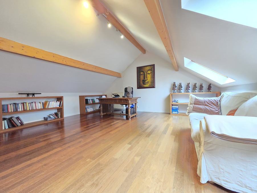 À l'étage, l'espace nuit comprend deux chambres destinées aux enfants, une salle de jeux, une salle de bains, un water-closet indépendant et une suite parentale composée d'une chambre, d'une salle de douche et d'une mezzanine ouverte sur le salon, apportant volume et caractère à l'ensemble.